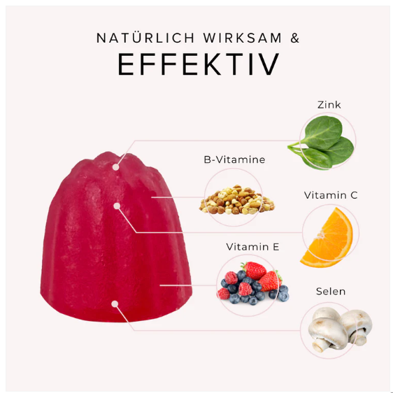 Dabei werden die Hair Booster Gummies ausschließlich mit natürlichen Früchten und Pektin hergestellt, völlig ohne Zuckerzusatz, künstliche Süß- und Farbstoffe und tierische Gelatine.