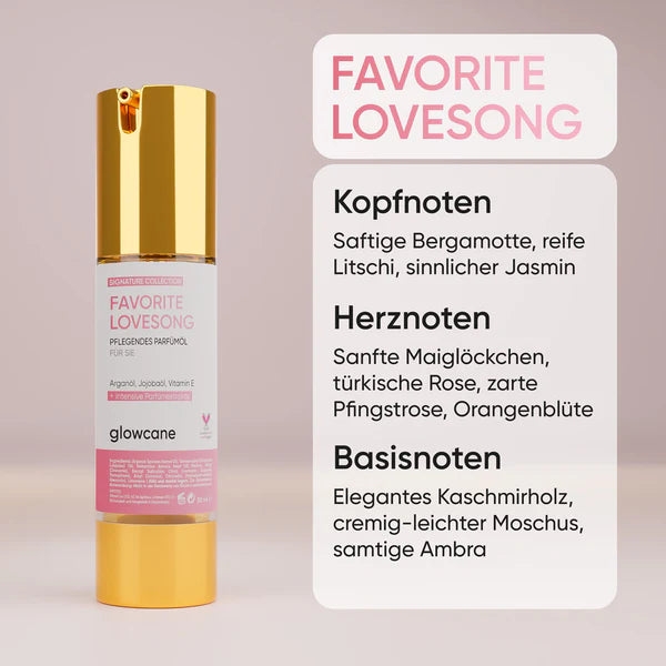 Favorite Lovesong ist dein romantischster Moment als Duft. Saftige Bergamotte, reife Litschi und sinnlicher Jasmin erinnern dich an das Kribbeln einer jungen Liebe. Ein Herz aus opulenter türkischer Rose, zarter Pfingstrose, sanften Maiglöckchen und verführerischer Orangenblüte schenkt dir pure Glücksgefühle. Samtige Ambra, cremig-leichter Moschus und elegantes Zedernholz umarmen dich sanft wie die Melodie deines Lieblings-Lovesongs. Romantisch, intensiv, unvergesslich.