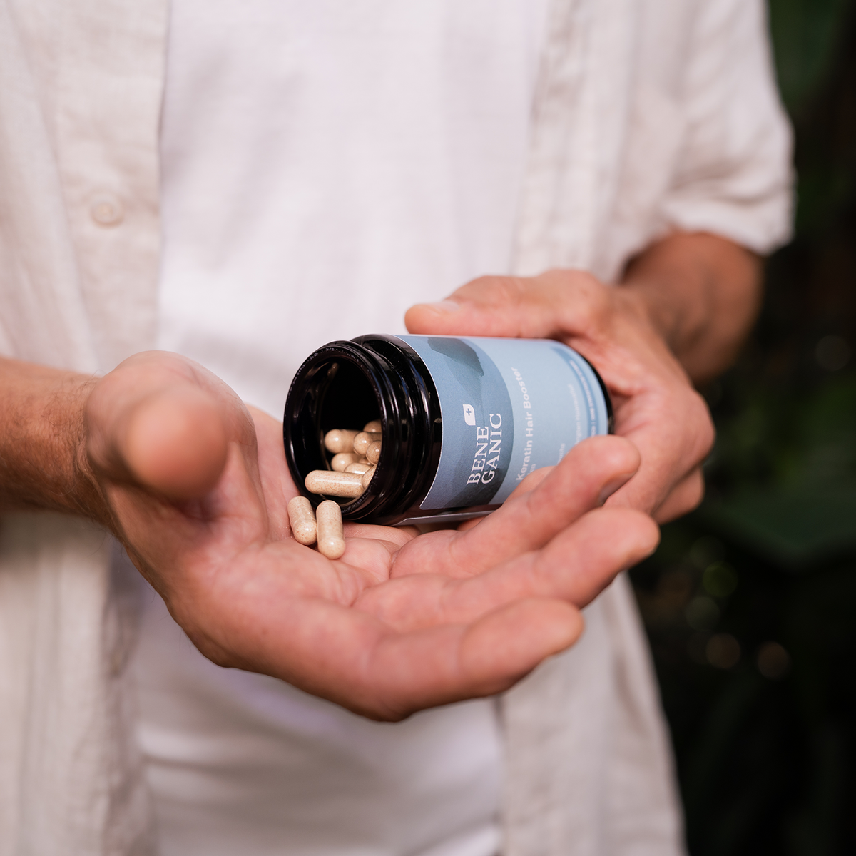 Der Beneganic Keratin Hair Booster Men ist eine speziell auf männliche Haarbedürfnisse abgestimmte Nahrungsergänzung mit dreifach starker Formel: Keratin‑Peptide, Pflanzenextrakte gegen hormonellen Haarverlust (z. B. Serenoa, Kürbiskernsterole) und antioxidative OPC aus Traubenkernen. Nur drei Kapseln täglich sollen die Haarwurzel von innen versorgen, Haardichte fördern und hormonbedingtem Haarausfall gezielt entgegenwirken.