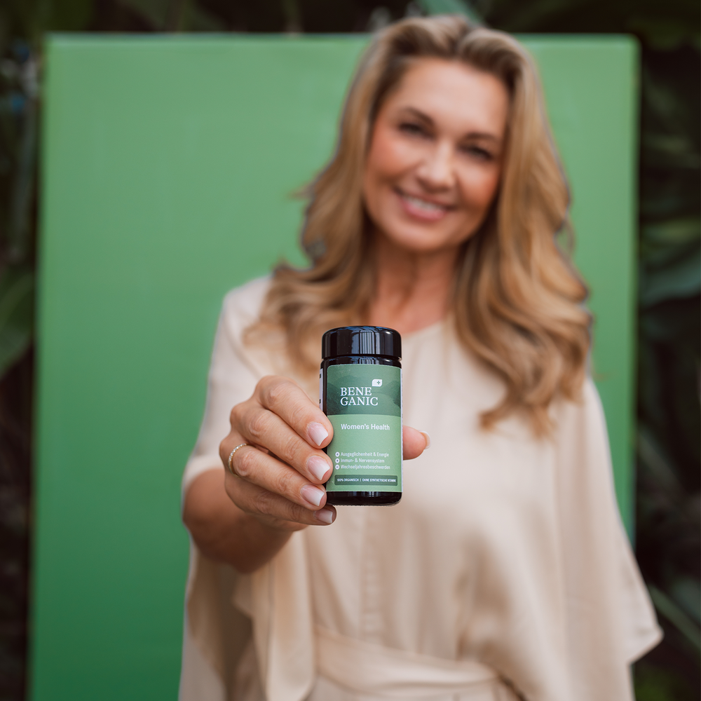 Women’s Health von Beneganic ist ein Nahrungsergänzungsmittel, speziell entwickelt für Frauen ab etwa 45 Jahren oder in und nach den Wechseljahren. Es kombiniert drei patentierte Wirkstoffe — Pycnogenol®, Safr’Inside™ und Signature Grape™ OPCs — mit pflanzlichen Vitaminen (B12, C, D₃) und Zink. Ohne hormonähnliche (östrogene) Wirkung, erlaubt die Formulierung eine langfristige Einnahme zur Unterstützung des Wohlbefindens in der zweiten Lebenshälfte.